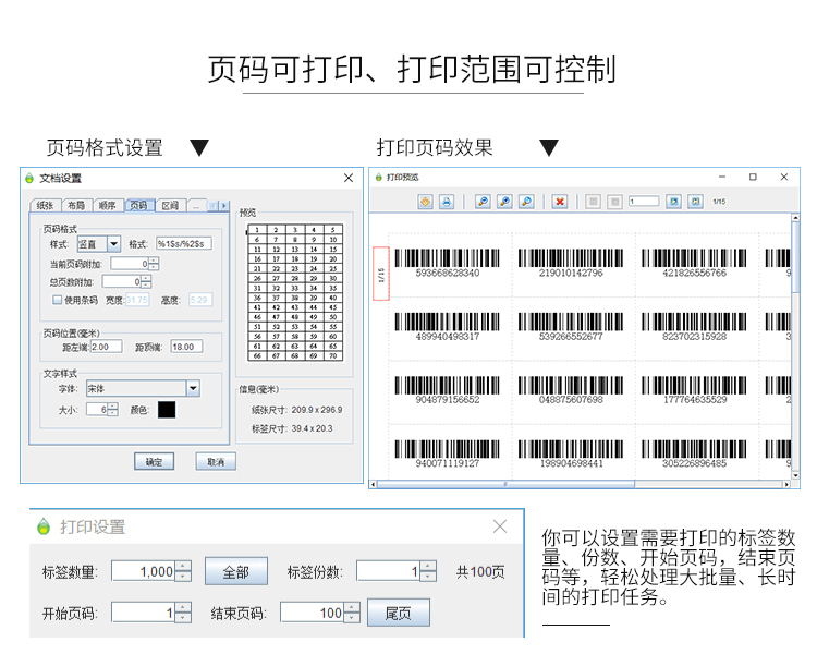 2.可打印页码。页码位置(左、上、右、下)可选择,页码字符串格式可自定义,页码字体颜色,大小可设置。